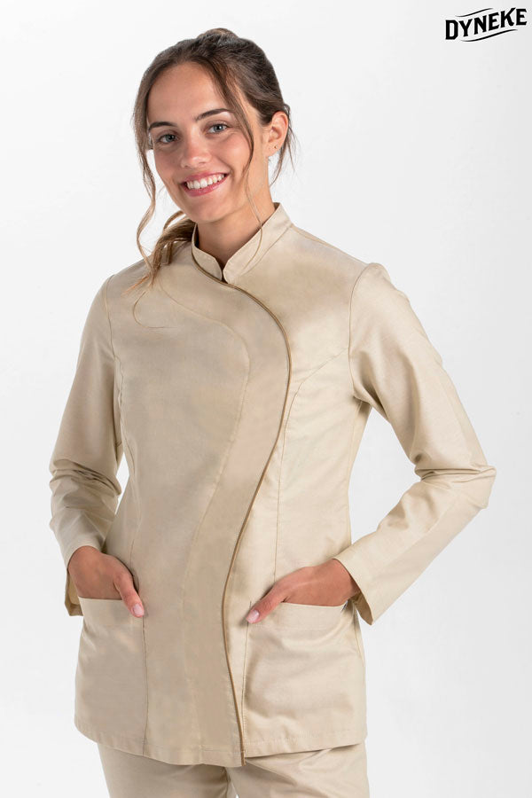 Chaqueta de mujer en manga larga fabricada en tejido rico en algodón. Cuello mao y vivo contraste dorado en la linea onda de los corchetes. Prenda entallada abrochada con corchetes ocultos. Dispone de dos bolsillos inferiores, con pequeño bolsillo interior en uno de ellos. Largo: 70 cm. Tallaje: SP-P-M-G-SG-SSG-XG. Propuestas: comercio, centros de belleza, estética, fisios, farmacia, hoteles