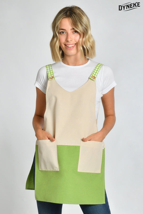 Estola para comercio en tejido loneta beige y verde. Tirantes en tejido de cuadros verde y botón efecto madera. Dispone de dos amplios bolsillos. Se abrocha con botones regulables a ambos lados para conseguir un efecto más entallado. Talla: UNICA. Largo: 82 cm.Propuestas: comercio en general, cafeterías, panaderías y restauración en general