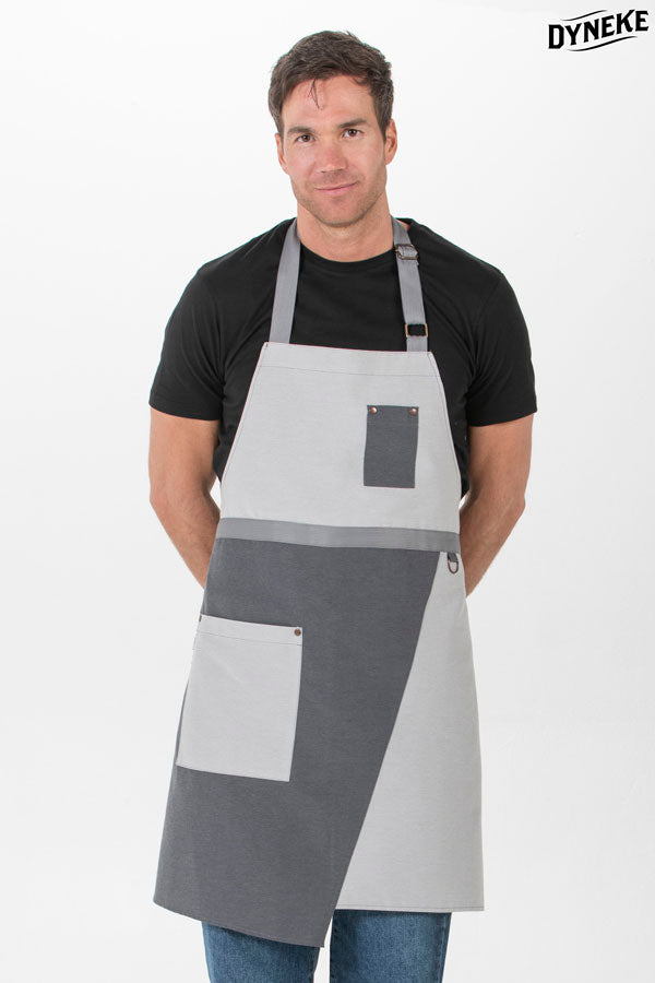 Delantal peto envolvente con diseño asimétrico fabricado en tonos gris claro combinado con gris ceniza. Tirante gris regulable con hebilla. Dispone de un bolsillo inferior y un bolsillo pecho acabado con remaches . Cintas grises para atar. Detalle hebilla en la cintura. Cinta interior para colgar el delantal. Talla: ÚNICA. Largo 84 cm x 77 cm ancho.Propuestas: bares, terrazas, cafeterías, comercios y restauración en general.