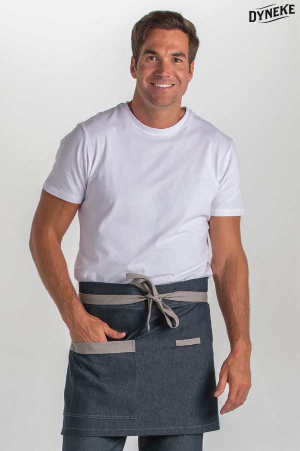 Delantal corto tejano con cintas en loneta beige. Detalle zig-zag con la cinta en los laterales de la cintura. Amplio bolsillo divisorio. Contraste loneta beig en bolsillo y trabilla para colgar trapo. Talla: ÚNICA. Largo 44 cm x 88 cm ancho. Propuestas: terrazas, bares, cafeterías, hosteleria en general, alimentación...