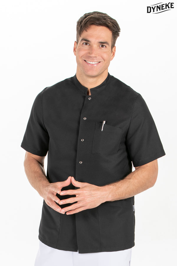 Chaqueta basica unisex de microfibra negra. Manga corta y cuello tirilla. Se abrocha con corchetes. Tiene dos bolsillos inferiores y un bolsillo superior. Largo: 73 cm. Fabricada en un tejido ligero, suave al tacto, de secado rápido y fácil planchado. Tallaje:SP-P-M-G-SG-SSG-XGPropuestas: esteticistas, fisoterapeutas, centros de spa, comercio y dependencia en general.