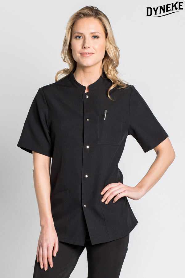 Chaqueta para comercio y estetica, de M/C. Cuello tirilla. Cierre corchetes de arandela. Con 3 bolsillos, 1 superior y 2 inferiores. Color negro. Largo 73 cm. ATENCION: TALLAJE UNISEX.(consultar med idas de mujer). 'Chaqueta 'Cuello tirilla'. Disponible en color blanco (700) y color negro (725) Tallaje: SP - P - M - G - SG - SSG - XG. PROPUESTAS:USO PARTICULAR, PELUQUERIAS, ALIMENTACION, FARMACIAS, DEPENDENCIA EN GENERAL.