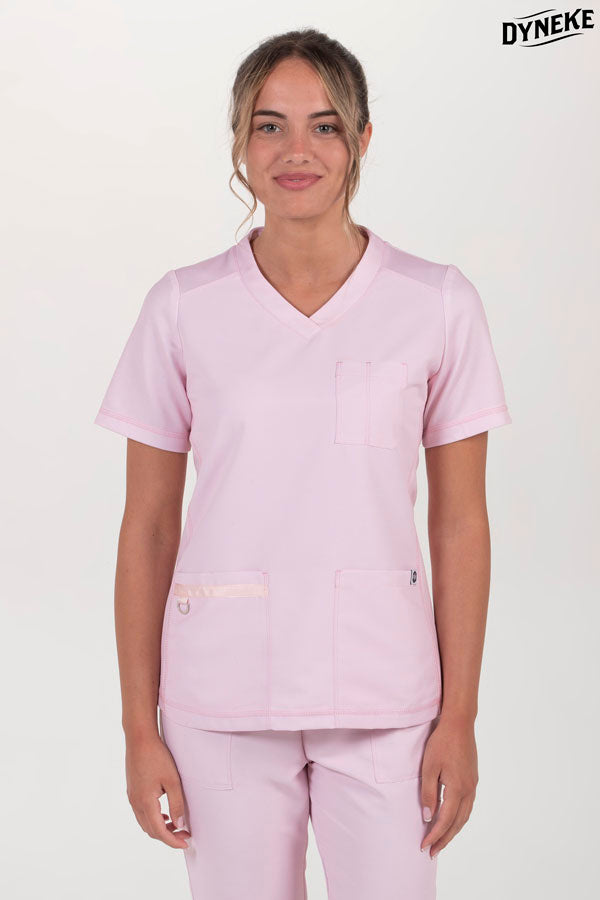 Casaca sanitaria de mujer en color rosa.Manga corta y cuello en pico. Confeccionada en punto pique en las mangas y espalda , y microfibra la parte delantera. Dos bolsillos inferiores y un bolsillo pecho con divisorio para el bolígrafo. Detalle cinta rosa y piqueta para identificación en uno de los bolsillos.Muy comoda y elegante. Largo: 63 cm.Tallaje: SP-P-M-G-SG-SSG-XG.Propuestas: clínicas, residencias, fisioterapeutas y sanidad en general