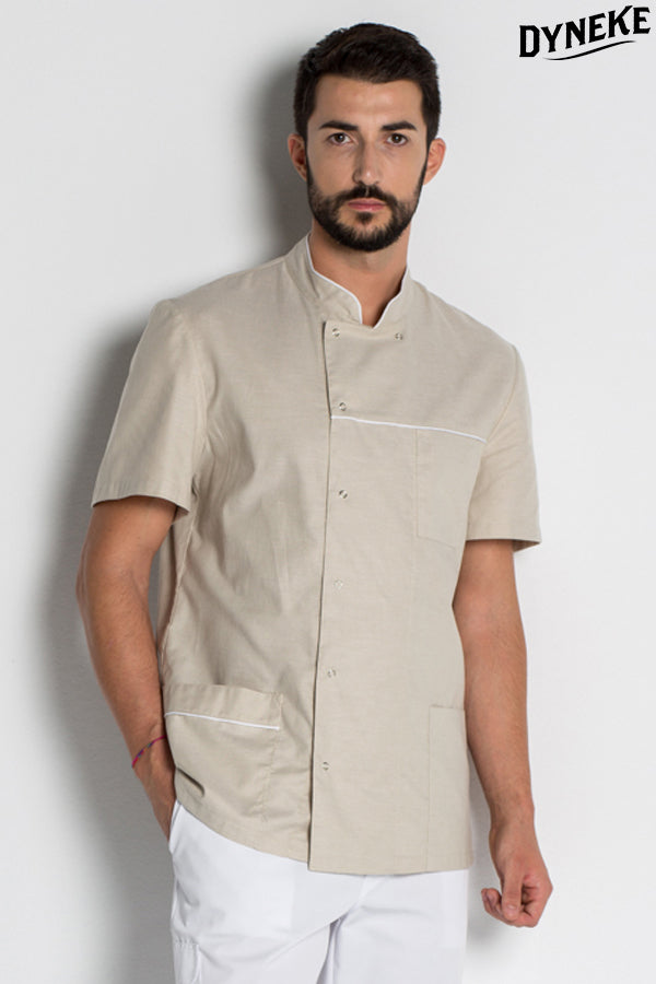 Chaqueta de caballero con cuello mao de manga corta. Tejido beige rico en algodón , vivo blanco cuello y en la linea del canesú. Se abrocha con corchetes metálicos. Tiene dos bolsillos inferiores y uno superior. Largo: 76 cms. Tallaje: SP - P - M - G - SG - SSG - XG.Propuestas: comercio, alimentación , farmacia, sanidad , comercio en general.