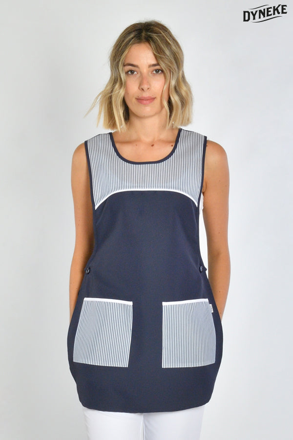 Estola para servicios de microfibra en azul marino combinada con tejido a rayas horizontales blanco/marino. Dos amplios bolsillos. Se abrocha con botones laterales situados en tiras de 3 botones para poder ajustar la prenda. Largo: 80 cm. Talla: UNICA.Propuestas: servicios domésticos, limpieza, empresas de mantenimiento, hostelería y servicios en general.