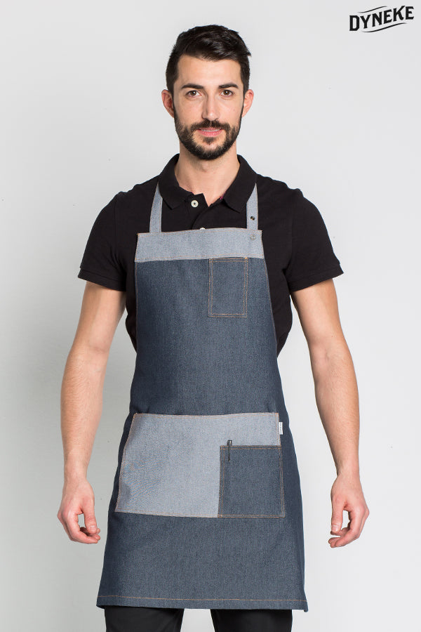 Delantal peto envolvente fabricado con tejido 'tejano'. Cinta de cuello ajustable con corchetes. Dos bolsillos inferiores y uno de superior pequeño. Contraste en gris en las cintas y bolsillo.Talla: ÚNICA. Largo 77 cm x 78 cm ancho. Propuestas: restaurantes, terrazas, cafeterías, bares, sala, cocina, hostelería y restauración en general.