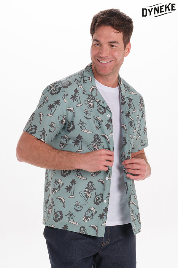 Camisa playera en tono verde estampado con motivo surf. Unisex. Tejido ligero de poliéster algodón . Prenda informal para llevar cerrada o abierta. Largo:74 cm Tallaje: SP-P-M-G-SG-SSG-XG. Propuestas : camareros terrazas, beach club, y uso particular.